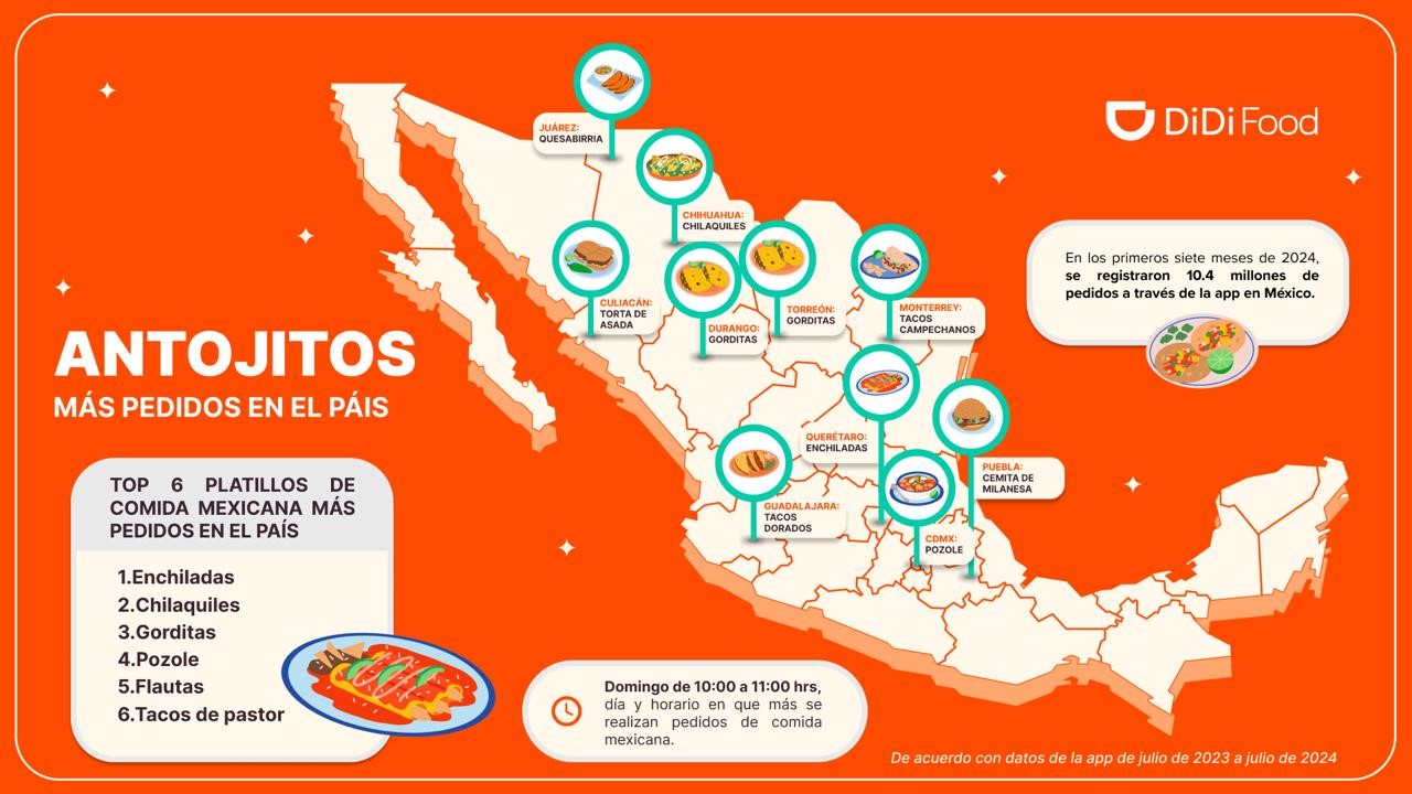 Las 10 ciudades con mayor demanda de comida mexicana son Ciudad de México,Monterrey,Guadalajara,Juárez,Puebla,Durango,Culiacán,Chihuahua,Querétaro y Torreón.