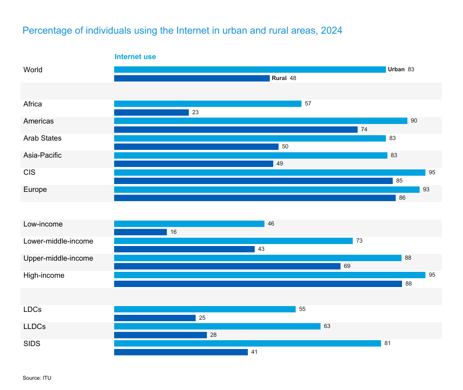Un nuevo informe de la UIT advierte que la brecha de acceso a Internet entre áreas rurales y urbanas se ha estancado en los últimos cuatro años. Mientras crece la urbanización,el éxodo rural deprime aún más el uso de Internet en las áreas remotas.